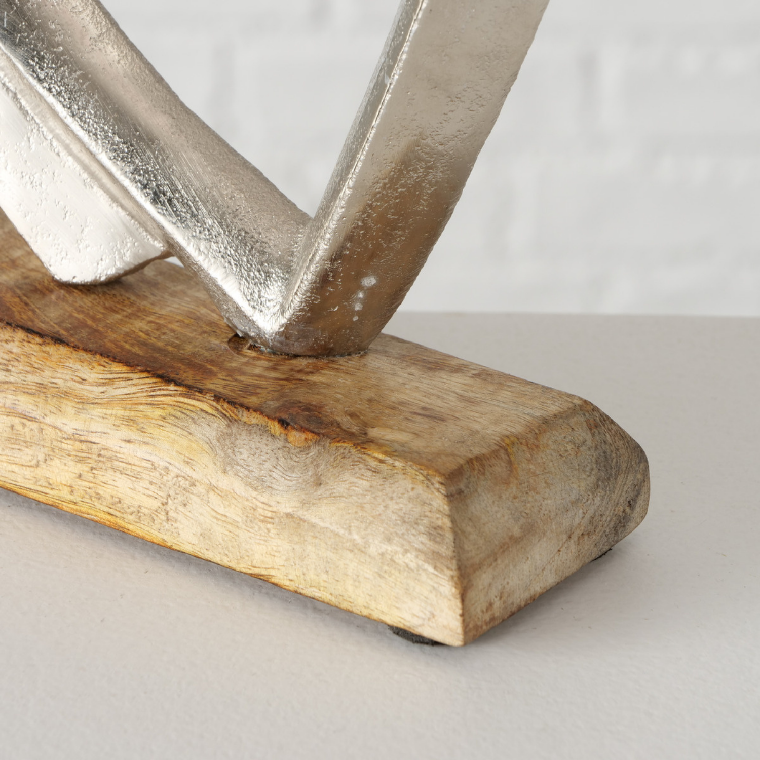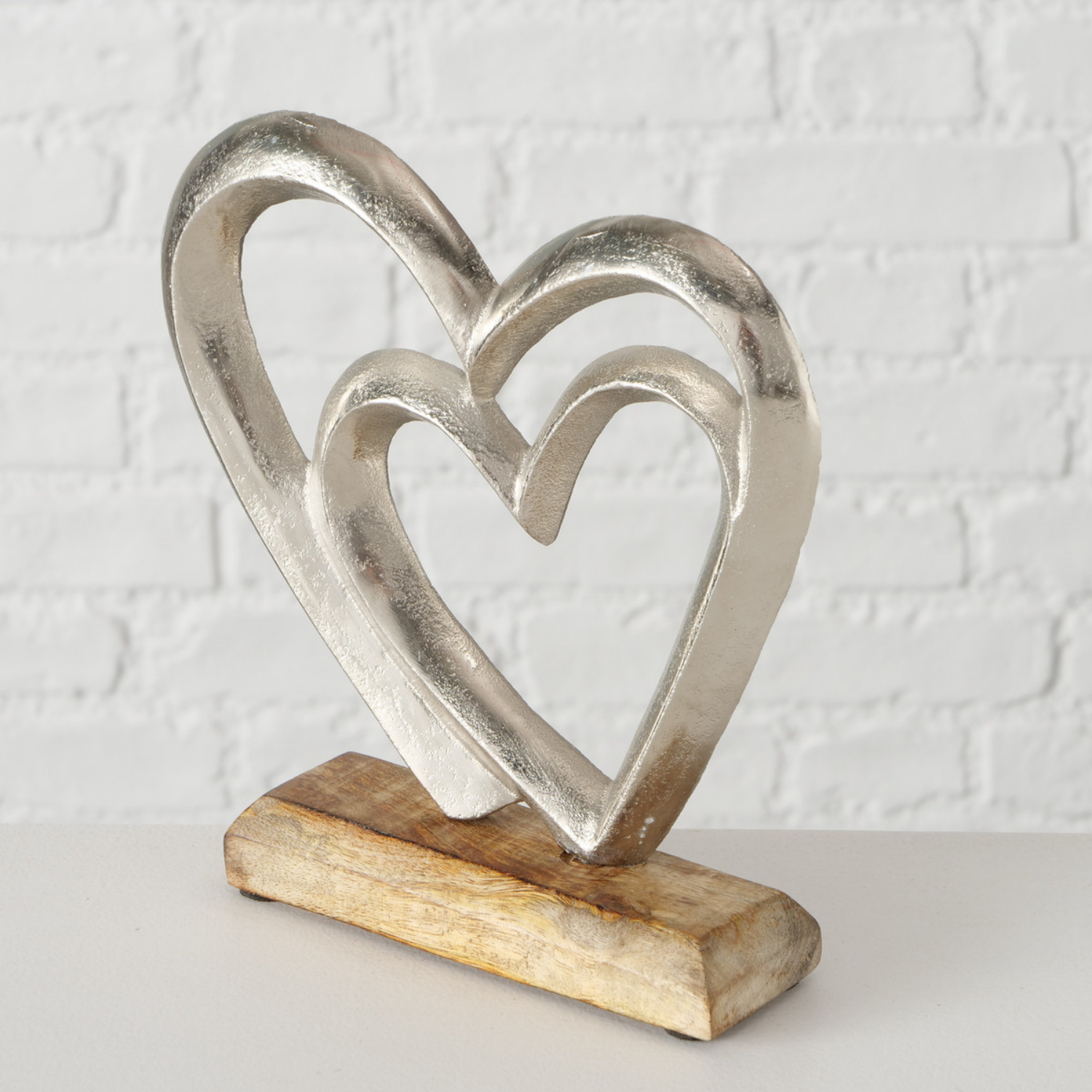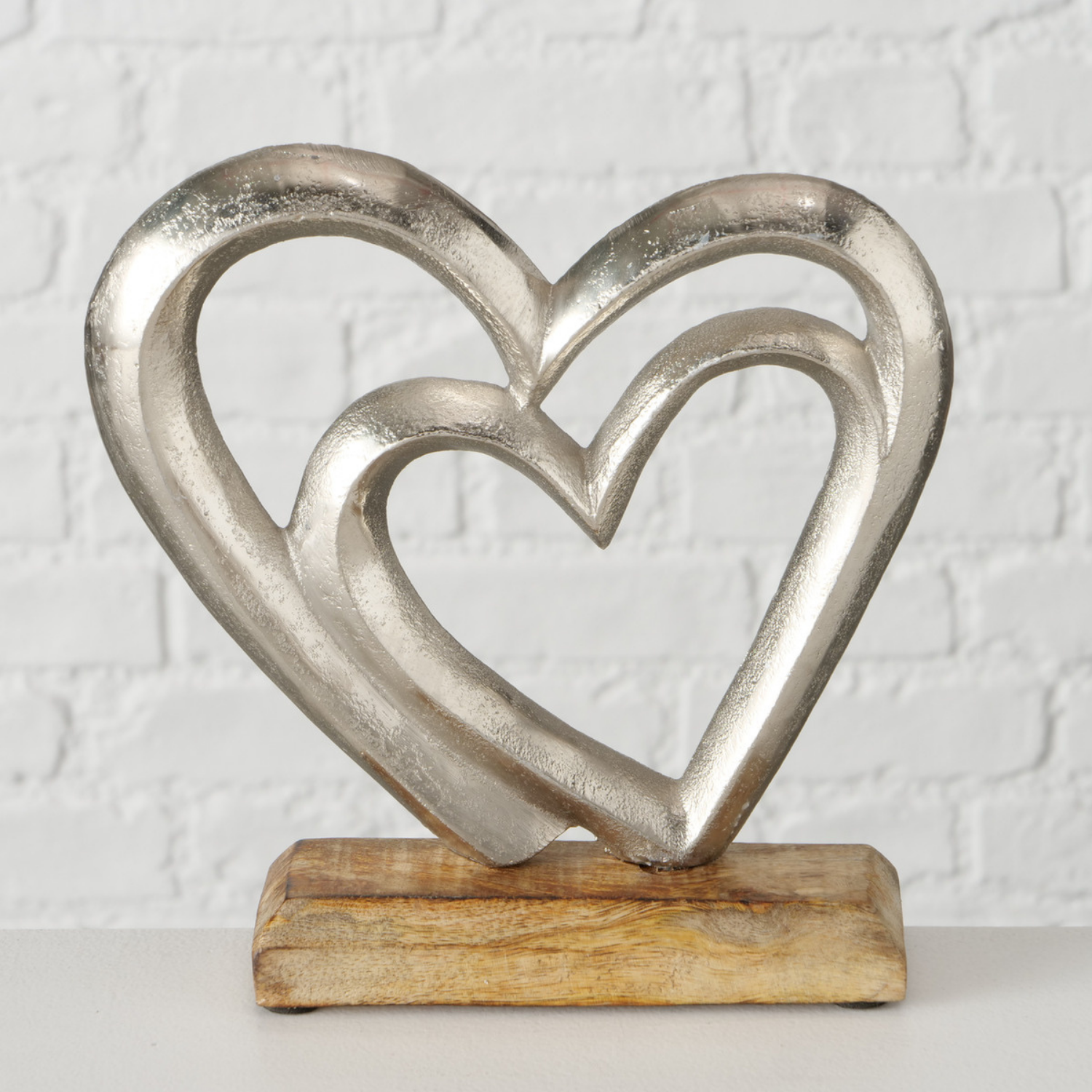 Elegante escultura de dos corazones entrelazados en metal plateado, colocada sobre una base de madera natural. Un símbolo atemporal de amor y unión. Perfecta para decorar tu hogar, o para regalar en ocasiones especiales como aniversarios, bodas o San Valentín.