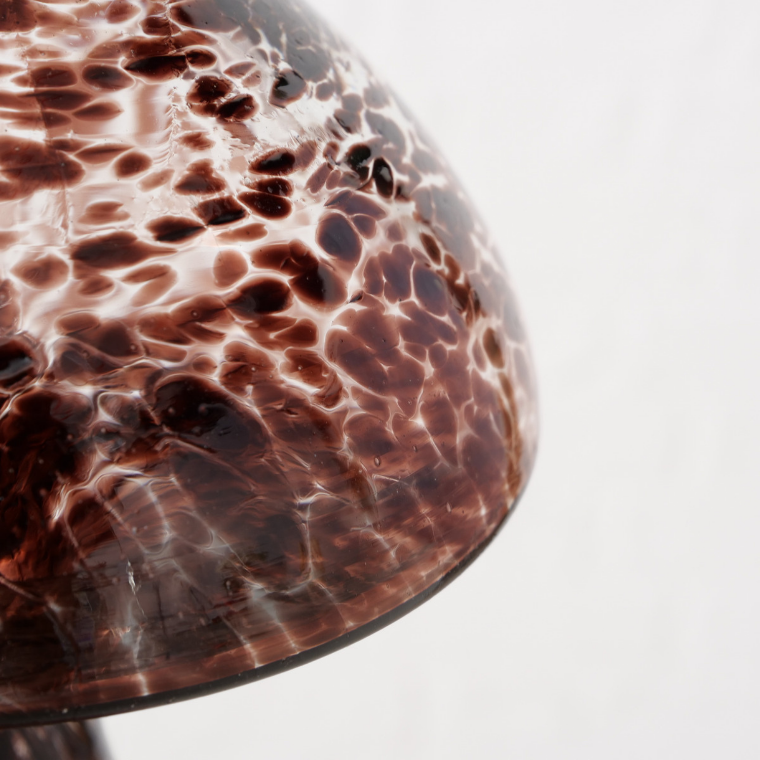 Este encantador adorno hecho a mano en forma de seta añadirá un toque de magia y originalidad a cualquier espacio. Elaborado en vidrio soplado, su sombrero presenta un patrón de manchas marrones sobre un fondo transparente que evoca la belleza de los bosques otoñales. El pie, con delicadas vetas marrones, completa esta pieza única , sofisticada y trendy.