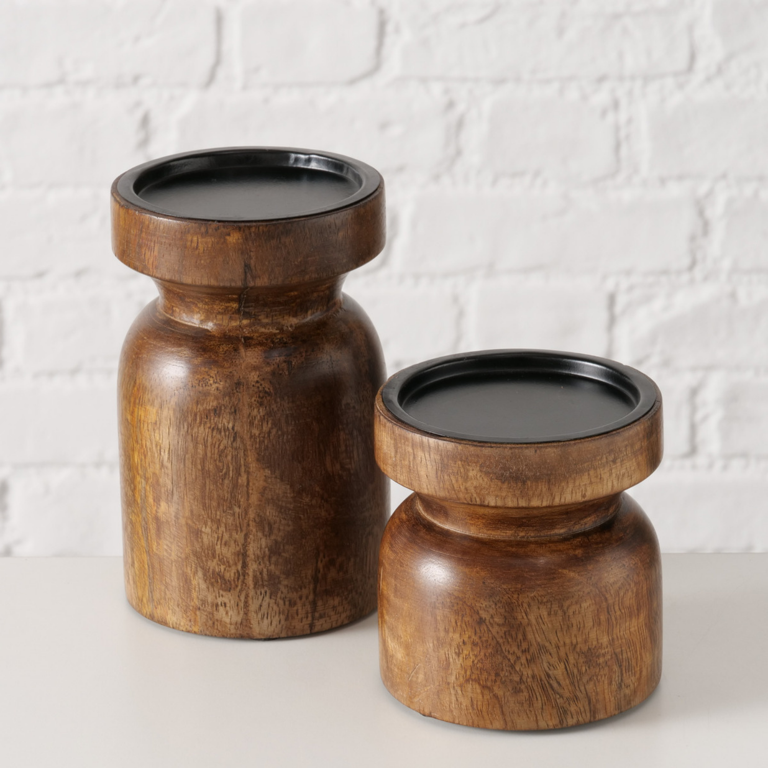 Este conjunto de dos portavelas de madera hecho a mano, aporta un toque cálido y natural a cualquier espacio. Su diseño sencillo y elegante, con líneas curvas y un acabado rústico, los convierte en una pieza atemporal. Perfectos para crear ambientes acogedores y relajados.